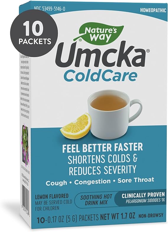 Nature’s Way Umcka ColdCare Soothing Hot Drink Mix, Feel Better Faster, Clinically Proven, Lemon Flavored, 10 Packets Visit the Nature’s Way Store 4.7 4.7 out of 5 stars 849 ratings | 7 answered questions Amazon’s Choice for “umcka hot drink”