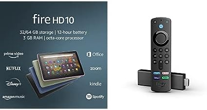 The ultimate entertainment experience with Fire TV Stick 4K and Fire HD 10 bundle. Stream your favorite TV shows and movies directly on your TV with Fire TV Stick 4K. Enjoy popular apps on Fire HD 10 including Netflix, Facebook, Hulu, Instagram, TikTok and more through Amazon’s Appstore (Google Play not supported. Subscription for some apps required).