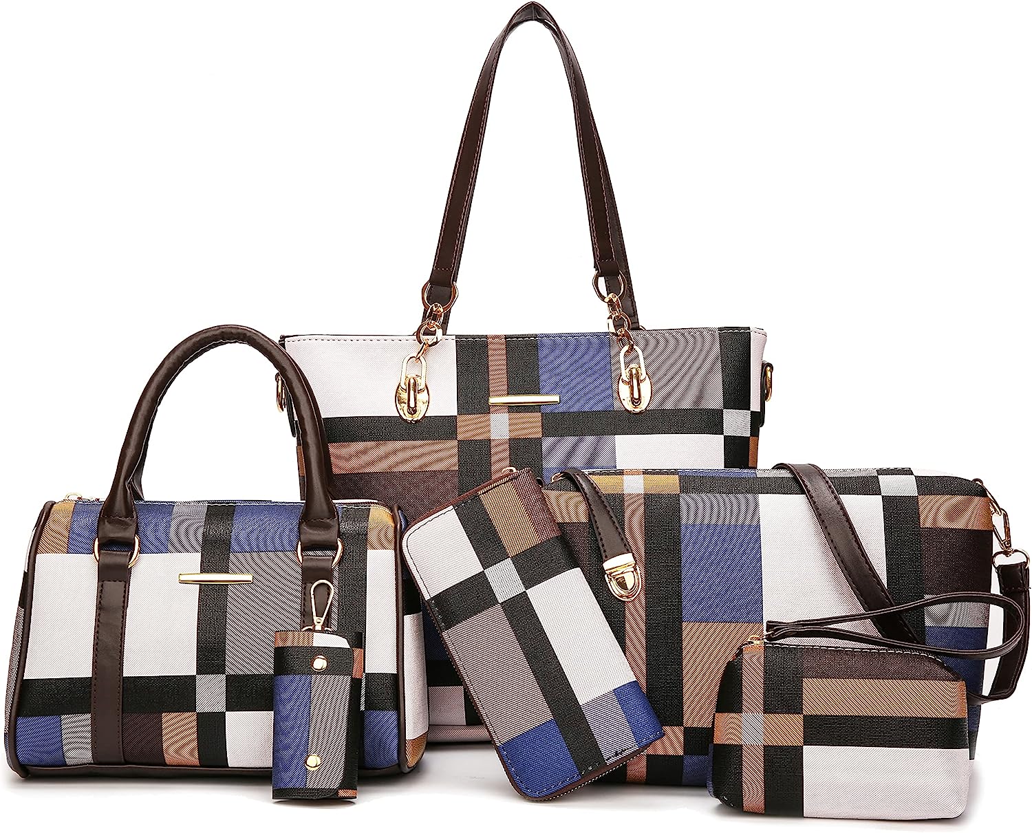 2E-youth 6pcs designer handbags for women! Blue purse color matching design, interpretation of a simple sense of fashion. Multi layered interior design, you can easily in any situation.Durable large tote bag can hold 14 inch Laptop or tablet,A4 documents or books, and your favorite high heels.Satchel shoulder bag can hold coin purse,long wallet,sunglasses,umbrella,cosmetics and other items.2E-youth clutch purse can hold your keys,lipstick,and other little items;