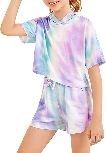 Top: Girls tie-dye crop tops, hoodies with short sleeve, casual loose clothing sets